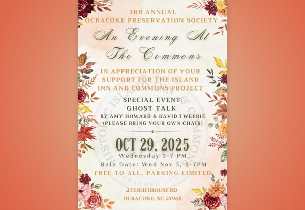We are looking forward to this event! Stories will start around 6:15 after the gathering for the Commons. We welcome donations to benefit the Ocracoke Preservation Society mission for the storytelling portion of the event! We hope to see everyone out!